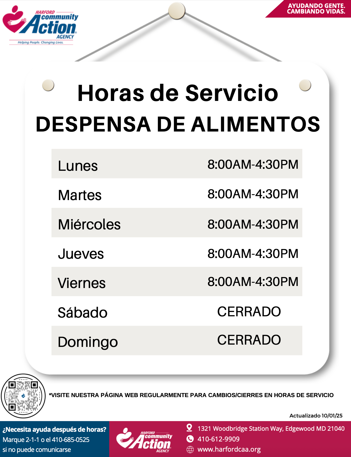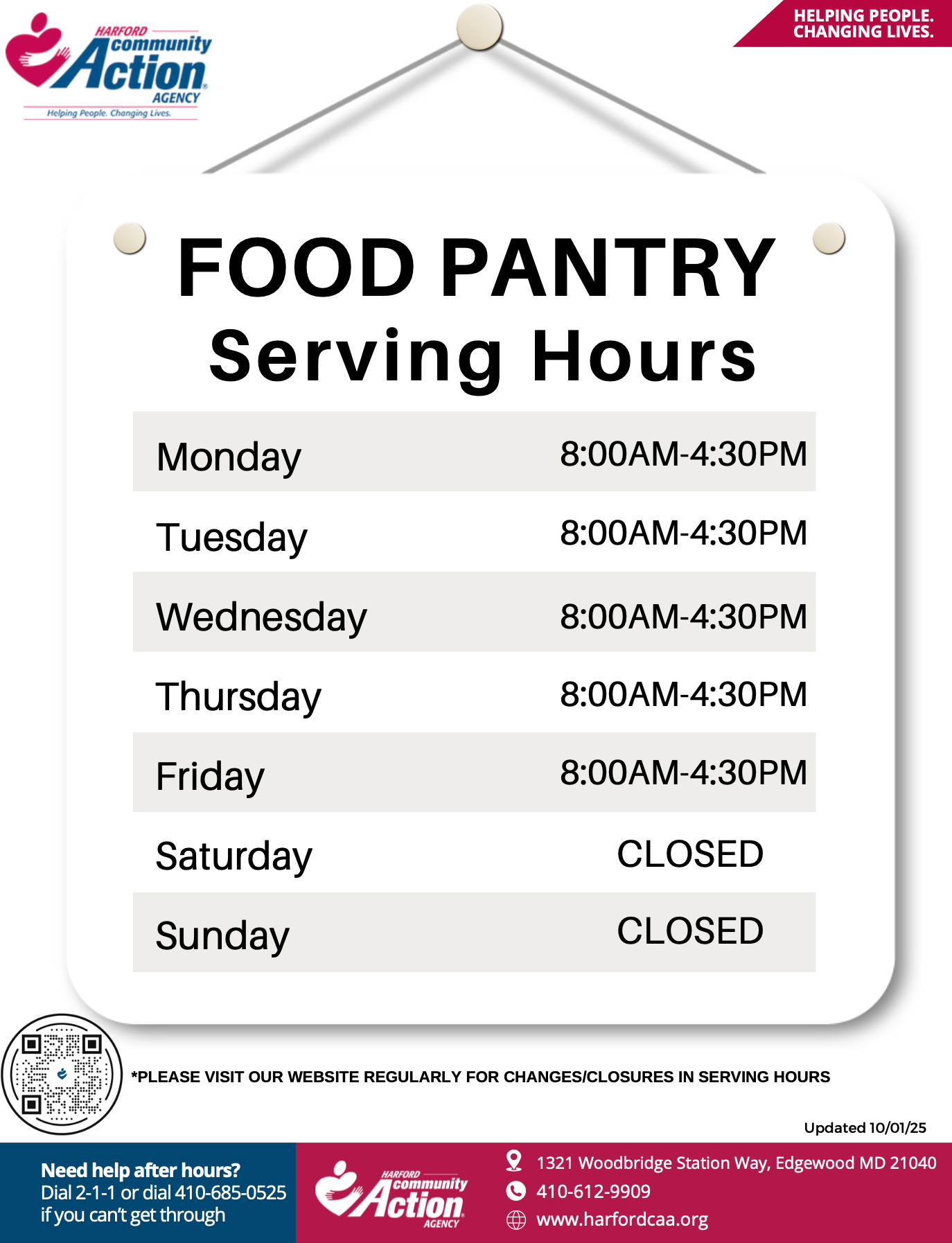 Harford Community Action Agency follows Harford County Government’s inclement weather policy. If Harford County is closed, so is HCAA. If Harford County operates on a delayed opening schedule, we will do the same. Please follow up-to-date bulletins on television and radio for information. HCAA will not post a separate closing announcement.